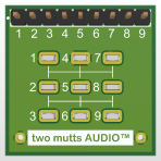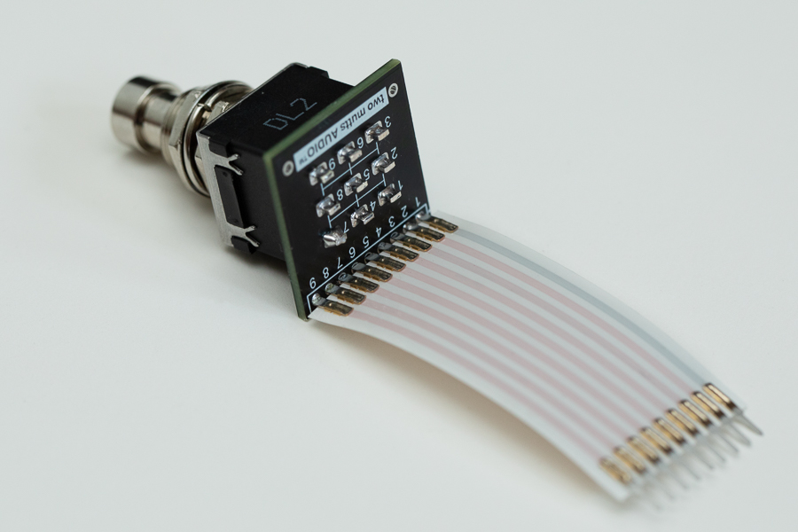 A huge value for rapid prototyping, the 9-way (0.1″ pitch) 2″ long flexible cable brings out each of the three switches in grouped ways. The wiring is uncommitted, but I chose to make pin 4 (on the middle switch) a ground connection, which connects to a solid, uninterrupted ground plane on the upper side of the board. This is done for two reasons – it’s typical to use the middle switch for LED switching, so pin 4 can be utilized for the ground return for the LED. Clearly, also having a ground plane above all audio signals helps prevent electrical interference / return paths also.
