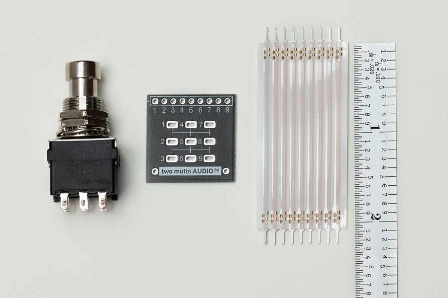 Made with only quality parts, the kit comprises an Alpha 3PDT switch, a 2-layer PCB, and a 2″ 9-way 0.1″ pitch flexible ribbon cable. (The 2″ dimension is just less than the length of the plastic carrier – as shown in the pics.)