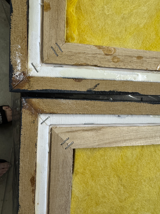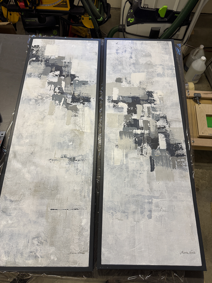 First, I built a wooden frame around the canvases, using coated MDF door trim. Easy to work with and smooth finish for painting… These were epoxied and pin-nailed in place, then painted.